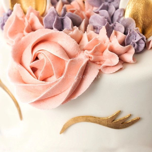 Mágico pastel de unicornio con un hermoso degradé morado y coral, perlas comestibles y hermosas flores de betún. Celebra una fiesta temática, unos XV años o cumpleaños.