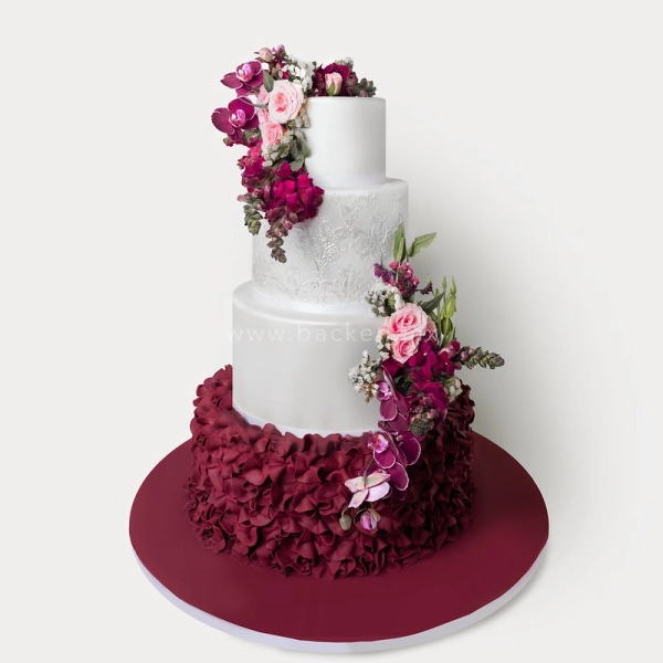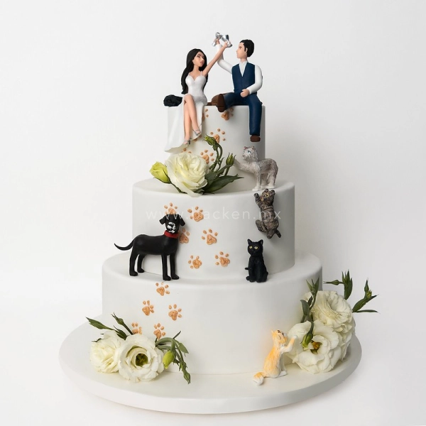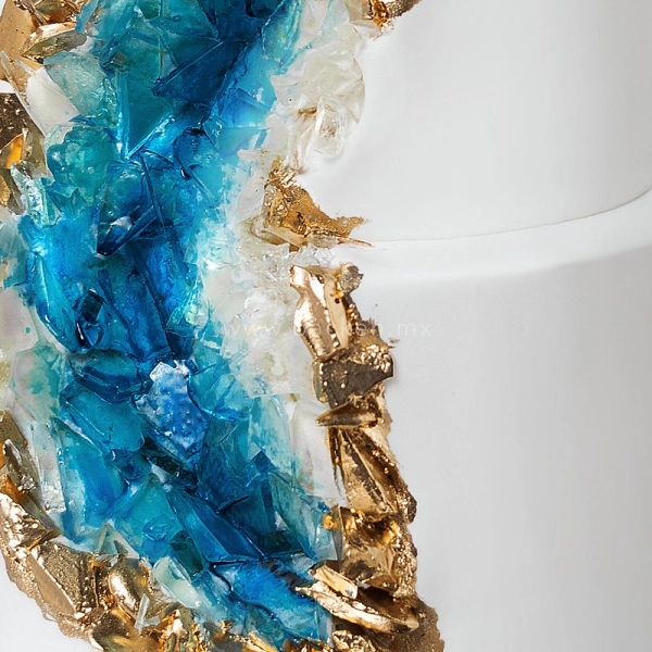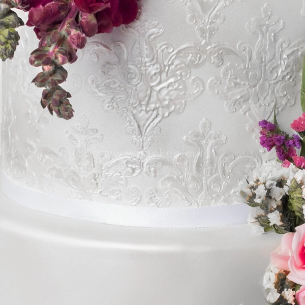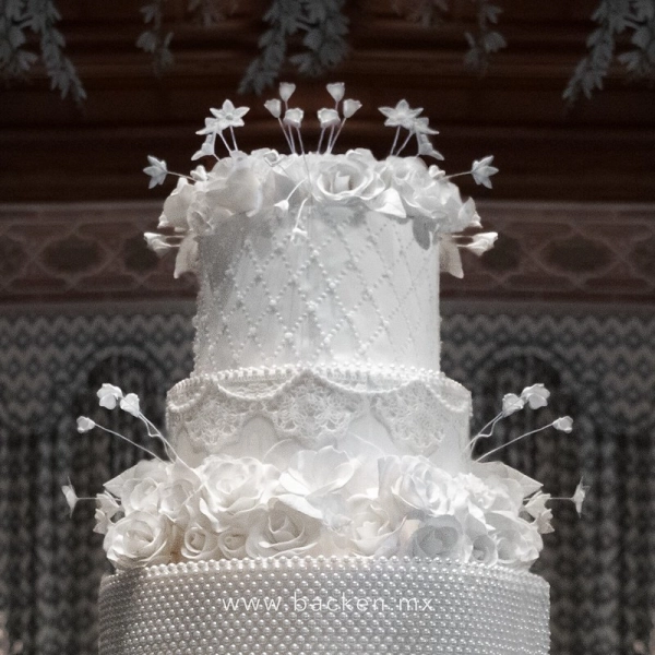 Este pastel de bodas es de 5 pisos exquisitamente decorados con perlas comestibles. Cada uno de los pisos tiene patrones distintos hechos de perlas y fino encaje de azúcar. ¡Incluso uno de los pisos está absolutamente cubierto de perlas! El pastel está adornado con flores de fondant hechas por artistas expertos, que coronan elegantemente esta creación. ¡Celebra tu boda con un pastel fuera de serie!