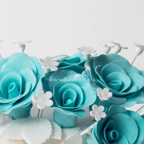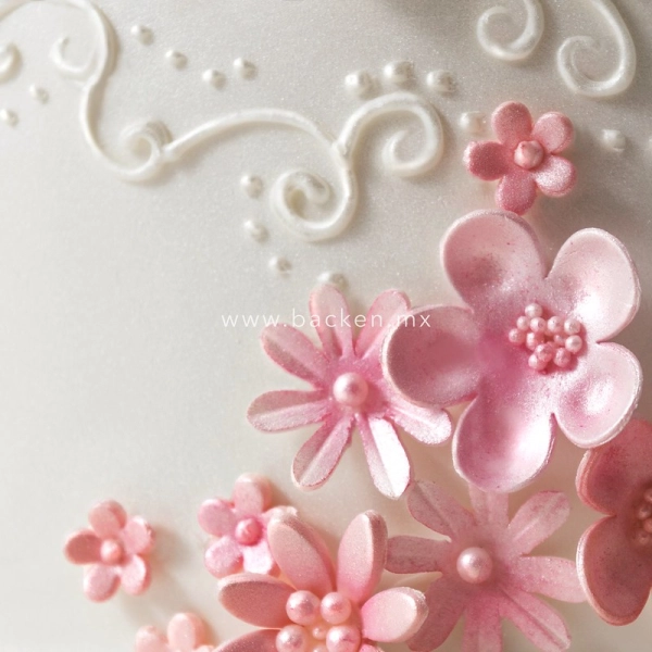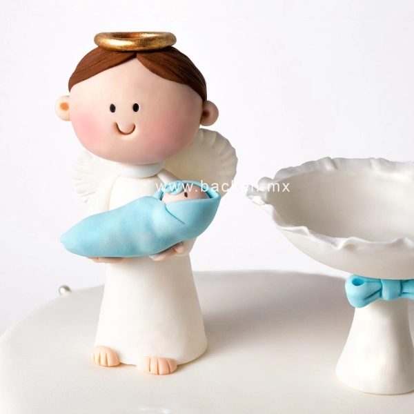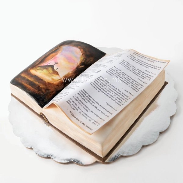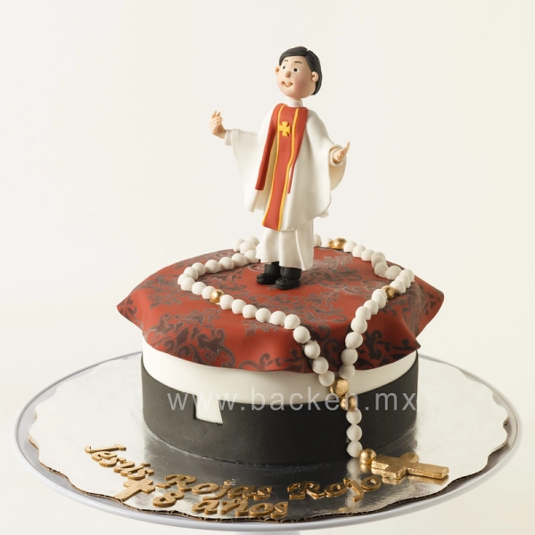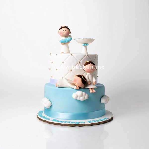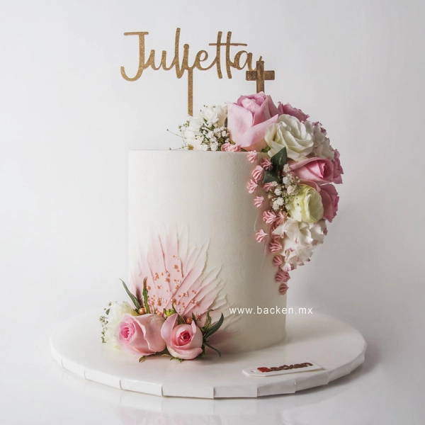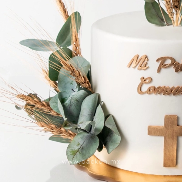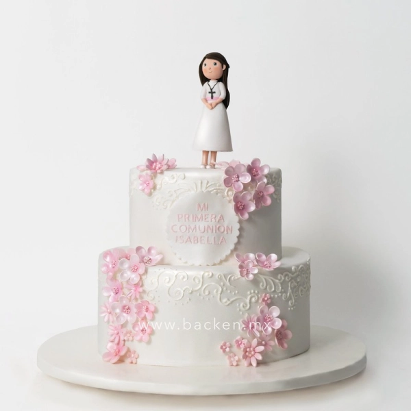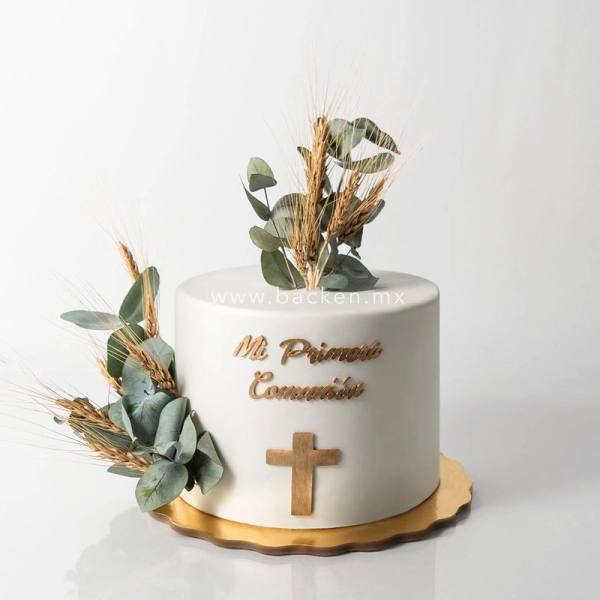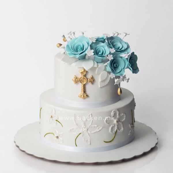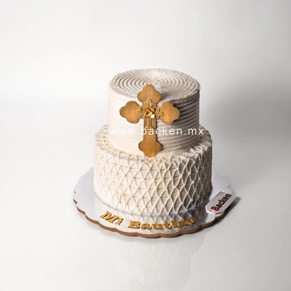 Este pastel rosa se distingue por su elegante cruz de fondant y la presencia delicada de mariposas, creando una composición visual encantadora y simbólica. Celebra su primera comunión o bautizo con este increíble pastel.