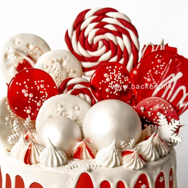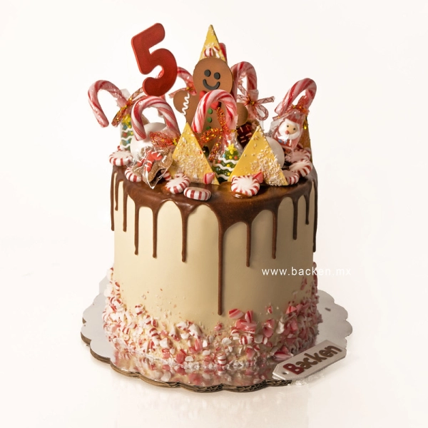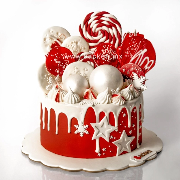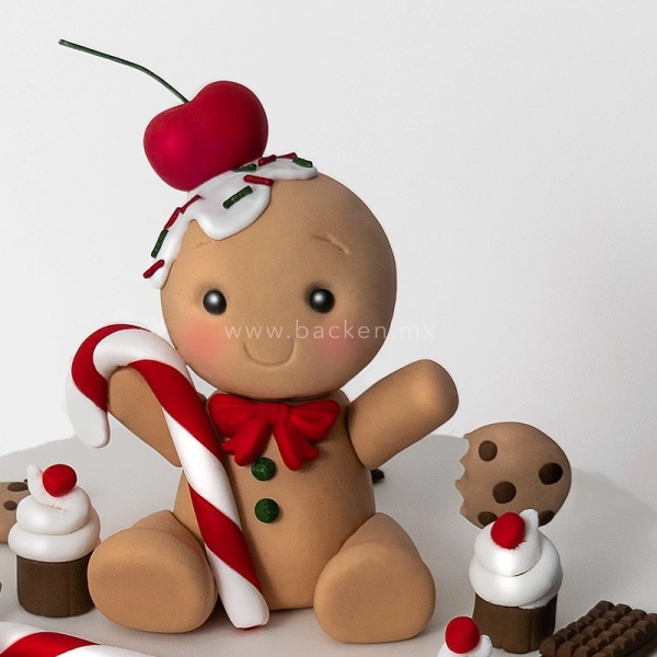 Adorable pastel en color rojo decorado con figuritas de galletas de jengibre navideñas hechas con fondant de la más alta calidad y dulces navideños. Celebra la navidad en familia con este hermoso pastel.