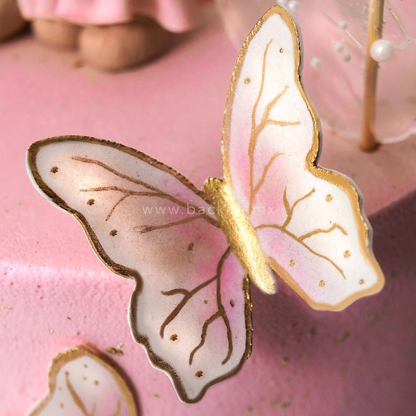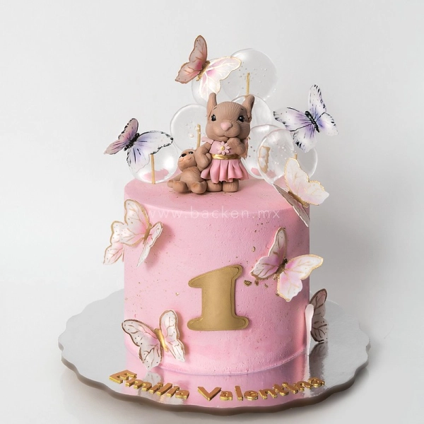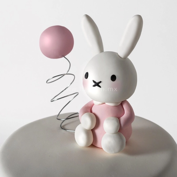 El primer piso está forrado con flores hechas de fondant de la mejor calidad en distintos tonos de rosa y el segundo piso está decorado con un adorable conejito comestible.
