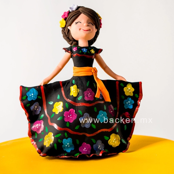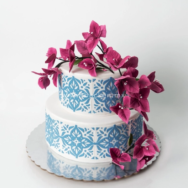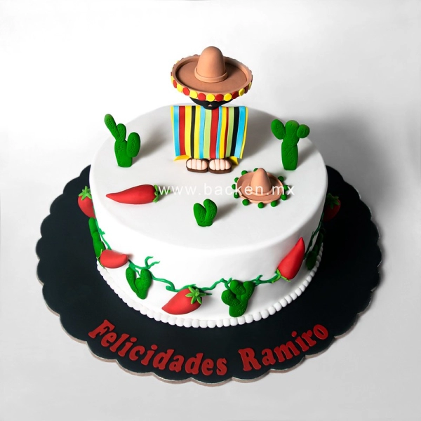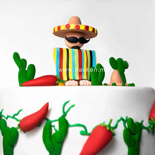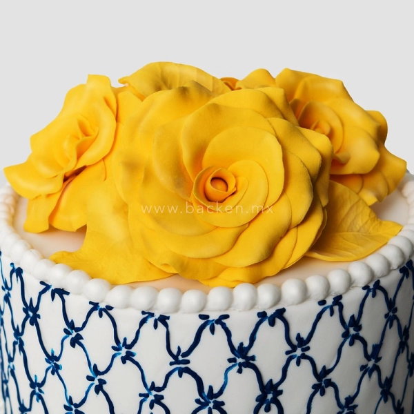 Vistoso pastel mexicano para las fiestas patrias con decorado de talavera mexicana y flores amarillas de fondant para festejar cumpleaños, boda o fiesta mexicana