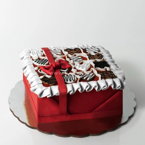 Celebra este 14 de Febrero con este bonito pastel en forma de cofre y en la parte alta una carta y corazones de fondant.