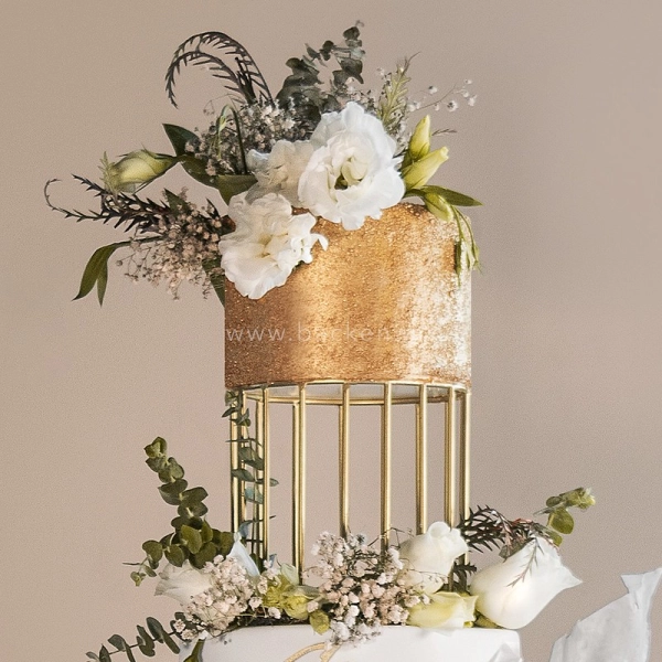 Hermoso pastel de bodas de cinco pisos, el primer piso es de utilería transparente, por dentro lleva flores naturales, los demás pisos están forrados con fondant blanco y decorados con obleas y flores naturales que agregan frescor al diseño.