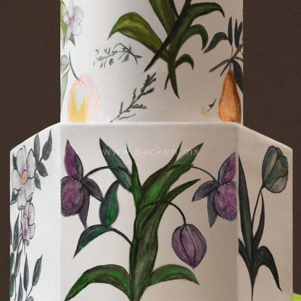 Celebra el día más importante de tu vida con este increíble pastel de bodas blanco de cinco pisos decorado con flores pintadas a mano por nuestros artistas y limones a los costados hechos con fondant de la más alta calidad.