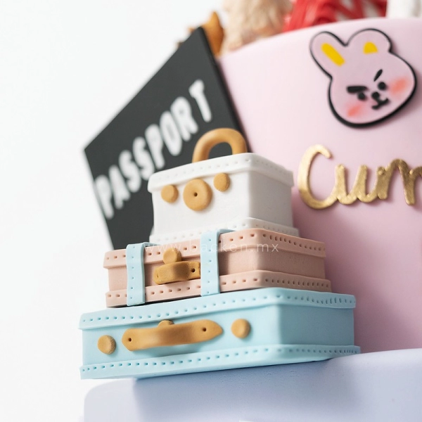 ¡Checa este pastel de paris! Lindo pastel de dos pisos cubierto de fondant lila y rosita. Lleva la torre eiffel hasta arriba y una figura de la cumpleañera con sus mascotas preferidas. Aviones, nubes, maletas y el planeta tierra decoran este pastel de temática viajera. ¡Personaliza tu pastel!