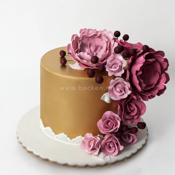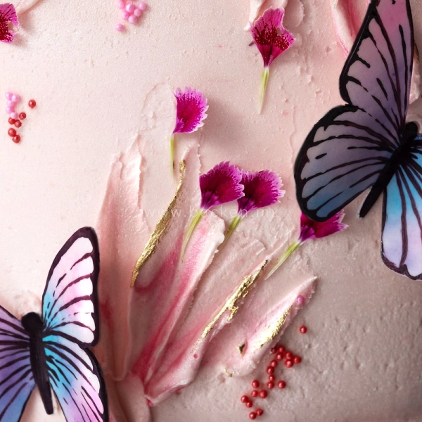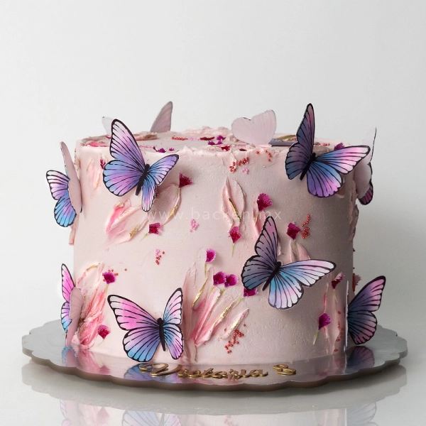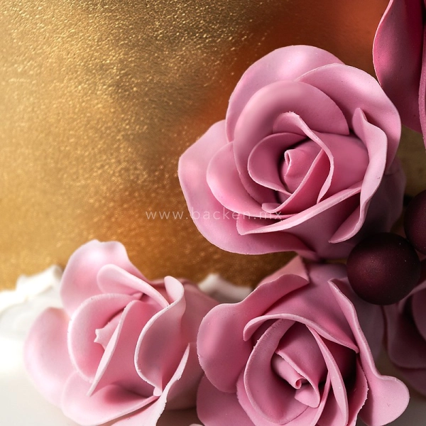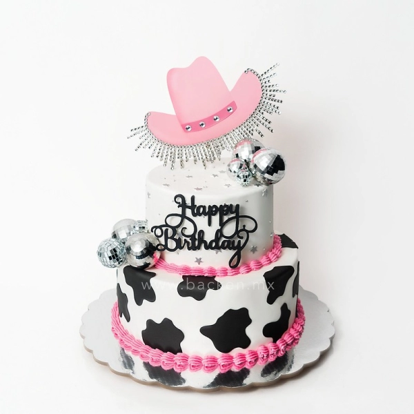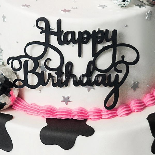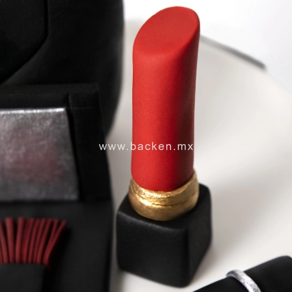 Pastel de Fondant para cumpleaños decorado con líneas blancas y negras y un moño hecho de fondant en color rosa. Está decorado con una elegante bolsa negra con detalles dorados, un labial y otros maquillajes hechos de fondant por nuestros artistas expertos.