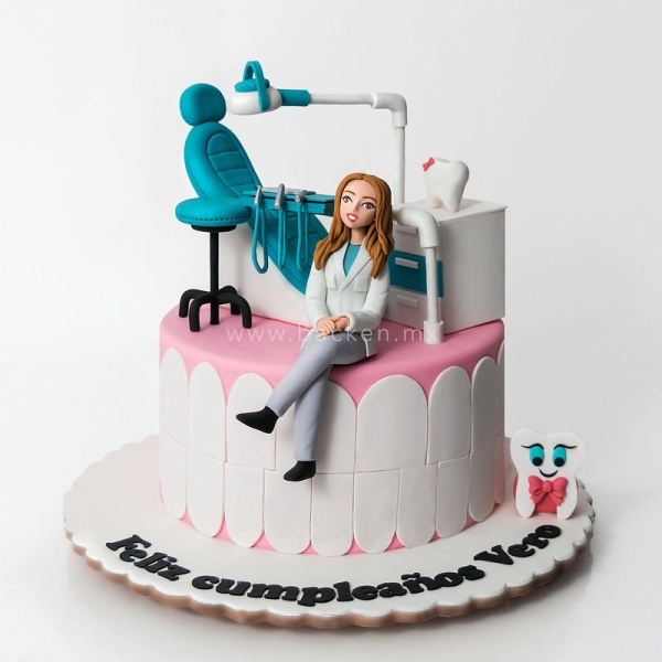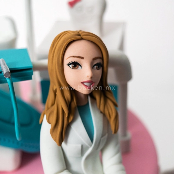 Este pastel, perfectamente esculpido en forma de una muela gigante, es una obra que evoca ternura y profesionalismo. Tiene una carita adorable que irradia alegría y entusiasmo. Sus ojitos y su dulce sonrisa capturan la emoción de una odontóloga recién egresada, lista para enfrentar su nueva aventura profesional con pasión y dedicación.