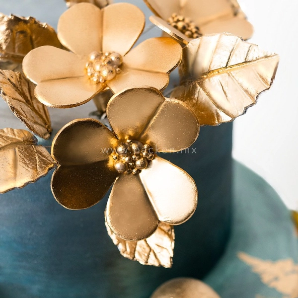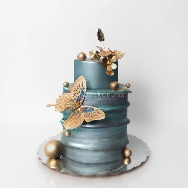 Hermoso pastel de XV años. El primer piso, decorado con delicados bordes en azul marino, reflejan la frescura y el esplendor de la juventud. En el segundo piso vemos intrincados patrones dorados, que añaden un toque de opulencia y glamur, representando el brillo y el entusiasmo de los XV años.