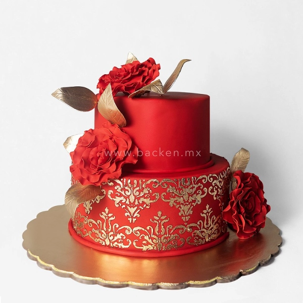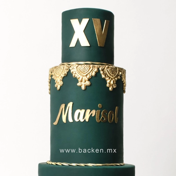 Celebra con un toque de distinción y elegancia, este pastel de cinco pisos en un elegante verde botella mate es el símbolo perfecto de una celebración de XV años verdaderamente inolvidable.