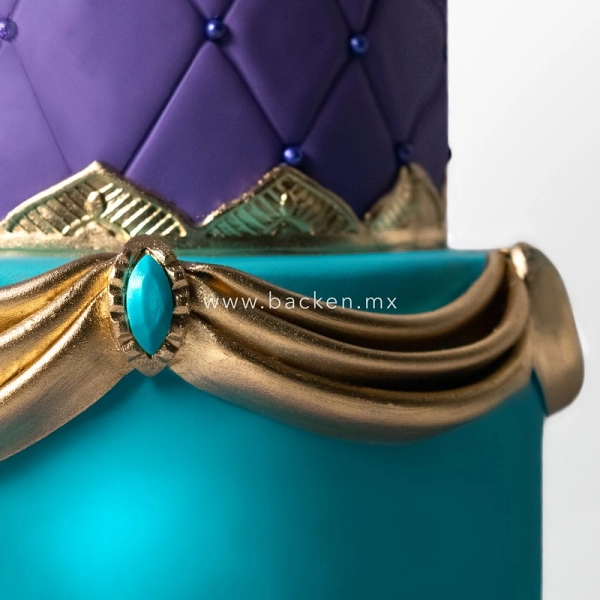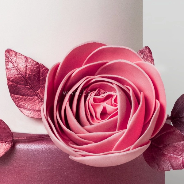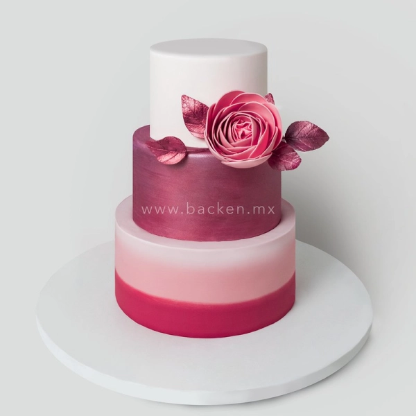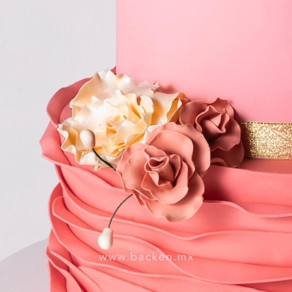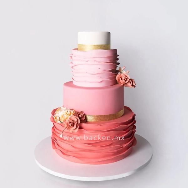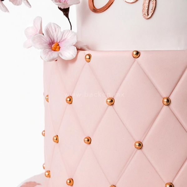 Celebra con este magnífico pastel en tres pisos en colores pastel y pequeños detalles en dorado que hacen resaltar el encanto y la elegancia del diseño. Delicadas flores de fondant en color rosa se pueden apreciar rodeando el pastel de modo sublime, haciendo que sea la pieza central perfecta para una celebración llena de encanto.
