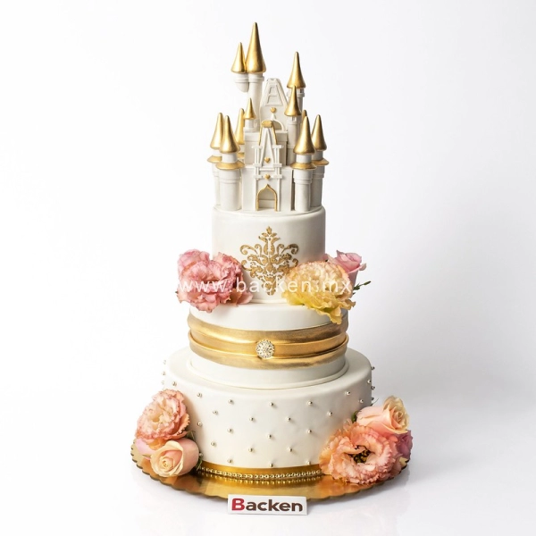 Este pastel de 6 pisos lleva incrustaciones de perlas finamente colocadas, añadiendo un toque de elegancia y sofisticación. Rosas naturales, adornan cada nivel, rodeando el pastel con su belleza y frescura.
