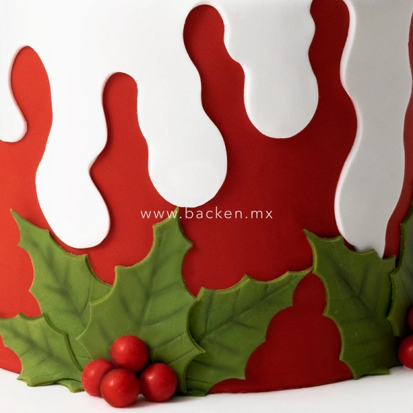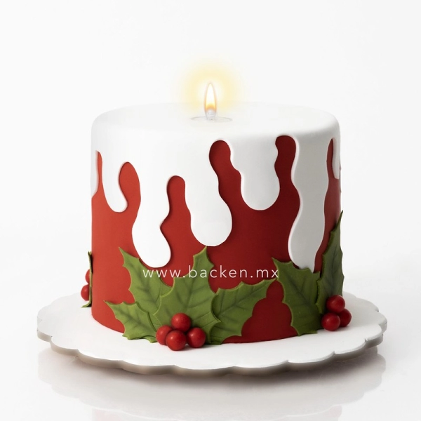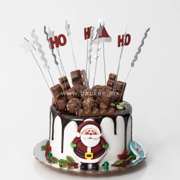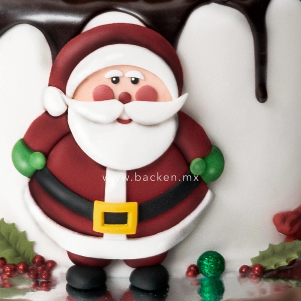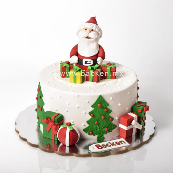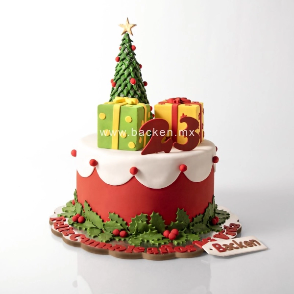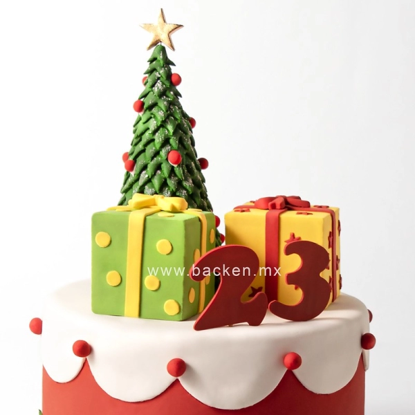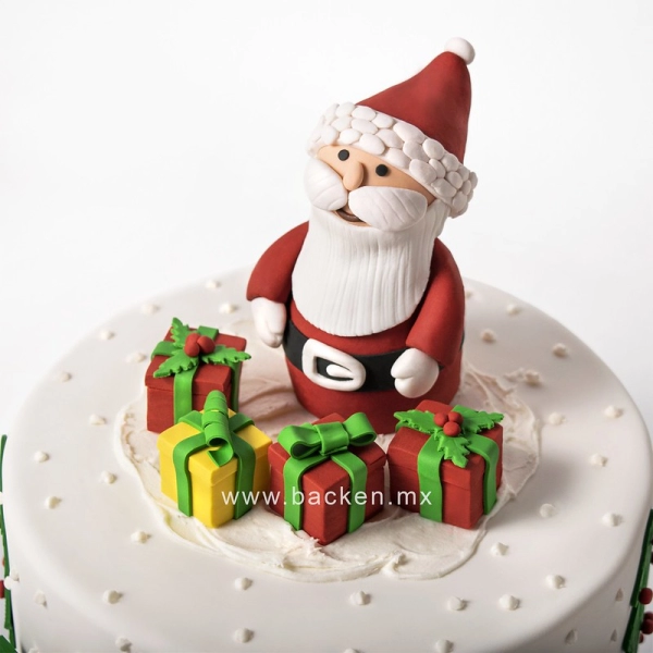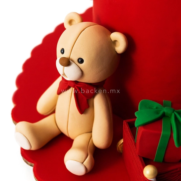 Este año, deja que tu mesa de Navidad cuente una historia inolvidable y celebra con este pastel personalizado navideño, con un toque mágico: un adorable osito de fondant cuidando una carreta repleta de regalos.