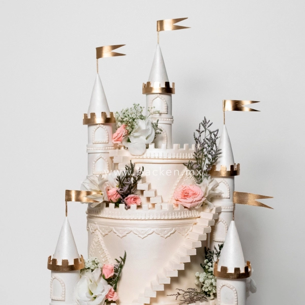 En lo más alto de un reino encantado, donde los sueños se hacen realidad y la magia nunca termina, se alza este pastel inspirado en un majestuoso castillo. Celebra con un pastel digno de un cuento de hadas.