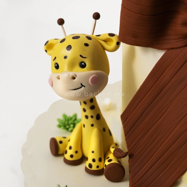 Bajo un cielo dorado, un leoncito de mirada dulce, una jirafa curiosa y un elefantito juguetón, todos rodeados de delicadas texturas y colores suaves que envuelven el pastel en un abrazo de ternura.