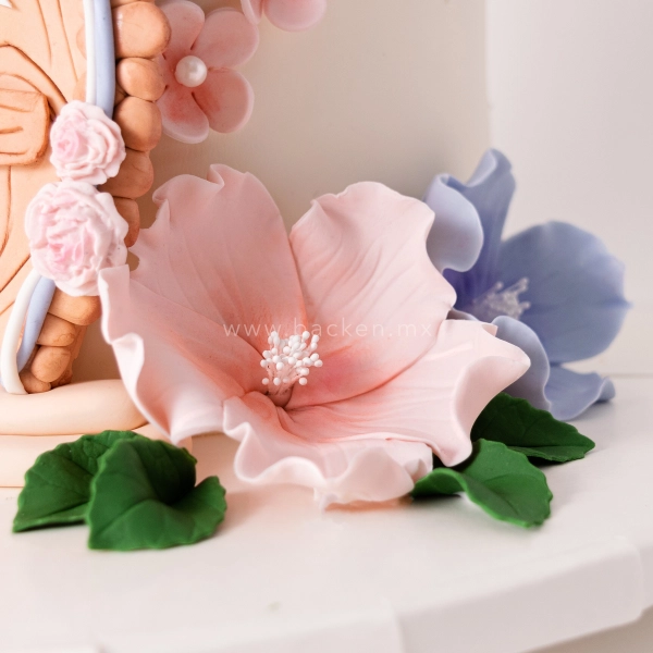 Este pastel personalizado para niña con temática de hadas del bosque crea un mundo mágico lleno de detalles encantadores. Destacan sus hongos rojos, flores delicadas y bellas hadas, todos elaborados en fondant, formando una escena de fantasía ideal para una celebración llena de magia.